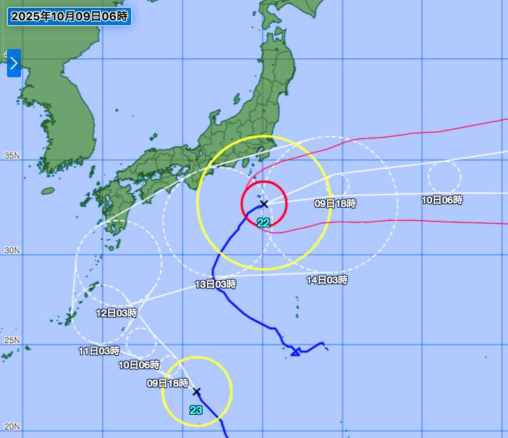 Today’s Fuji-san ( Typhoon 22 ) : 09/Oct/2025 Published 2025年10月9日 Modified 2025年10月9日 Author tamma Categories けさの富士山 Categories 台風(今朝の最低気温 18.6℃:昨日の最高気温 23.0℃ )台風22号が近づいていて昨夜から時折強い風が吹いています。22号の後にはすぐ23号が来ています。いずれも上陸はしないようですがちょっと気がかりです。