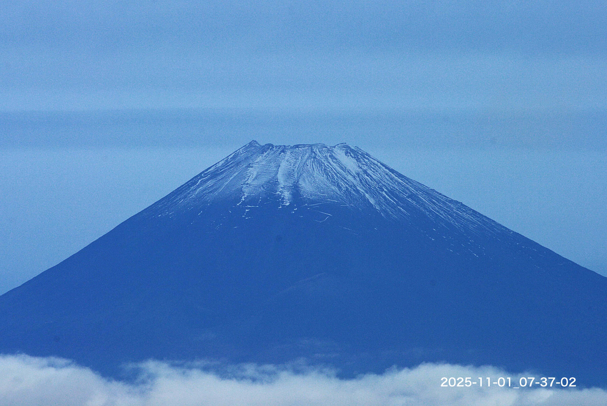(今朝の最低気温 13.2℃:昨日の最高気温 15.7℃ ) 山頂付近に積雪があったようで少し白くなっています。