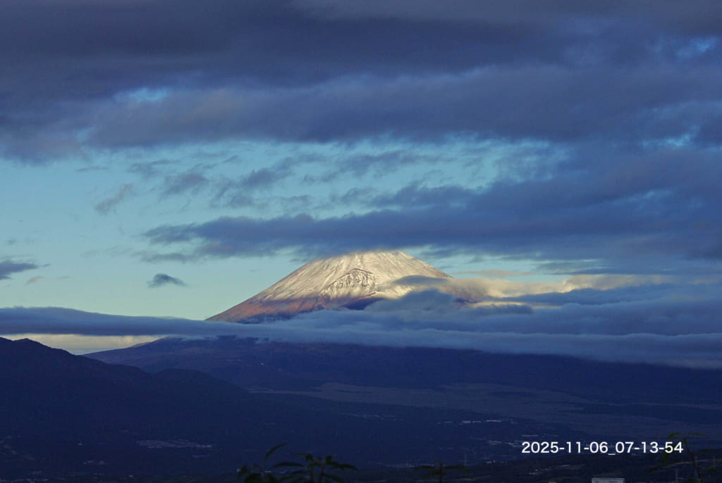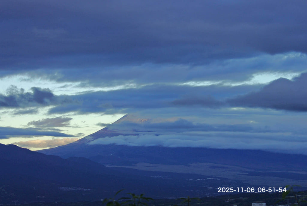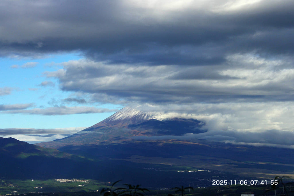 Today’s Fuji-san : 06/Nov/2025 Published 2025年11月6日 Modified 2025年11月6日 Author tamma Categories けさの富士山(今朝の最低気温 10.8℃:昨日の最高気温 13.9℃ )雲の下から積雪が見えます。昨日朝には積もっていなかったので、午後から夕方にかけて降った模様です。