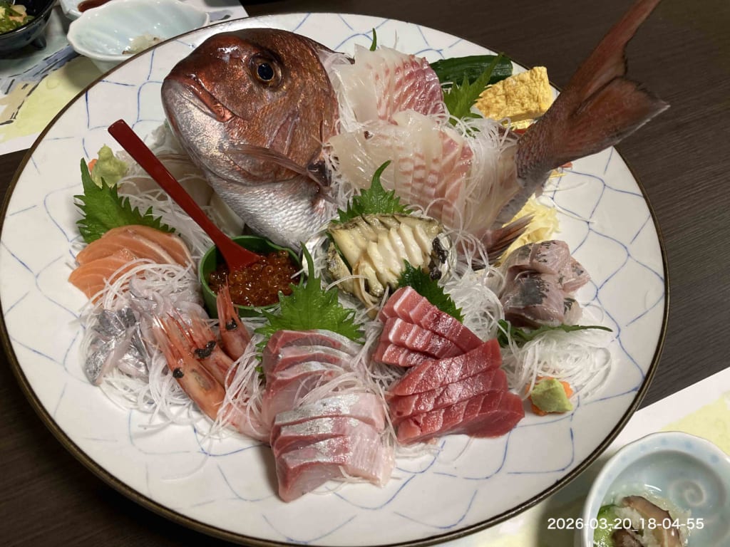 刺身の盛り合わせ、これで三人前です。このほかにもさまざまな魚料理が次々と出されて豪華な食事会となりました。